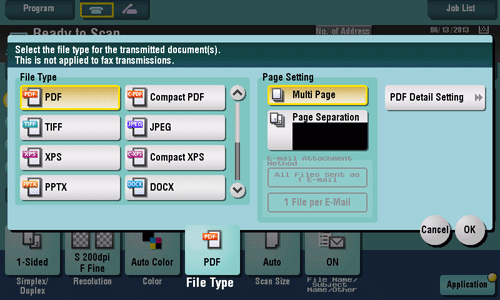 [PDF Detail Setting] | If [PDF] or [Compact PDF] is selected for file format, you can configure the PDF option settings. You can enhance security by attaching a digital signature that identifies the author of the file, by file encryption, etc. For details, refer to Here. |