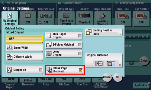 The [Blank Page Removal] function cannot be used with the functions by which the size of paper cannot be specified (the [Long Original], [Z-Fold Original], [Mixed Original] functions) simultaneously.