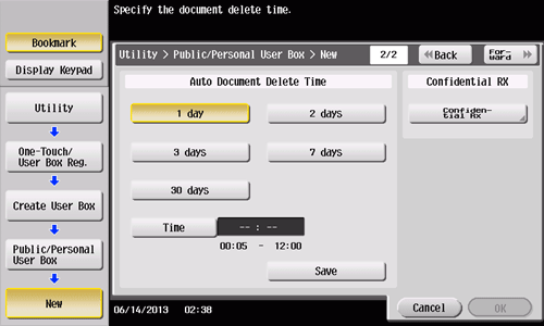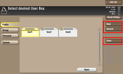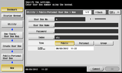 Tap [Utility] - [One-Touch/User Box Registration] - [Create User Box] - [Public/Personal User Box] - [New].