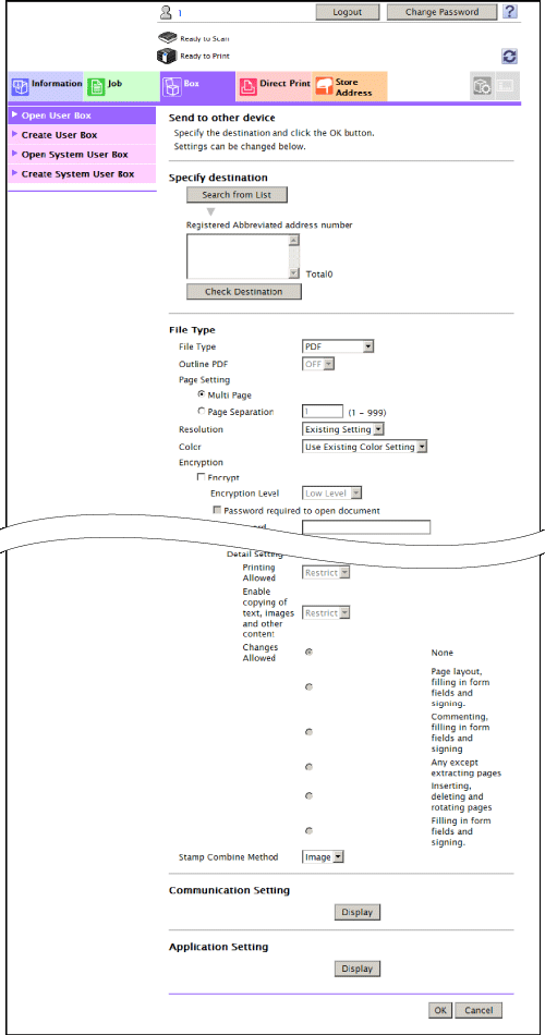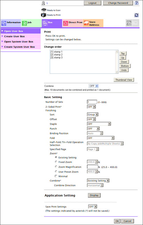 [Application Setting] | Configure more detailed setting such as Stamp or Send & Print. When using this function, click [Display]. |