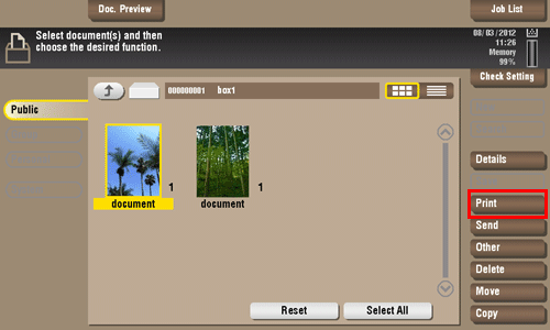 [Change order] | This option is displayed when multiple files are selected. You can change the file storage sequence if necessary. Select files and change their print sequence by clicking [Top]/[Up]/[Down]/[Bottom]/[Undo]. To display files as thumbnails, click [Thumbnail View]. |