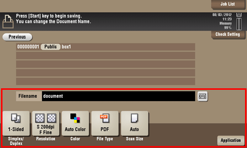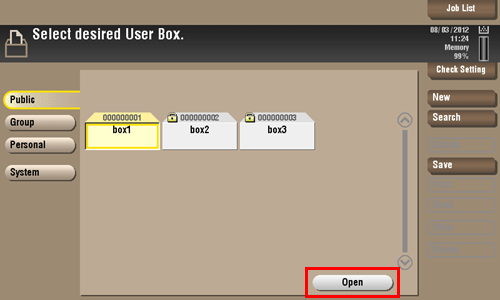 This example uses the Public User Box for explanatory purposes. To use a Personal User Box or a Group User Box, tap [Personal] or [Group] and select the desired box.