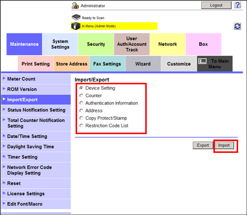 In the administrator mode, select [Maintenance] - [Import/Export] to select the information to be imported, then click [Import].
