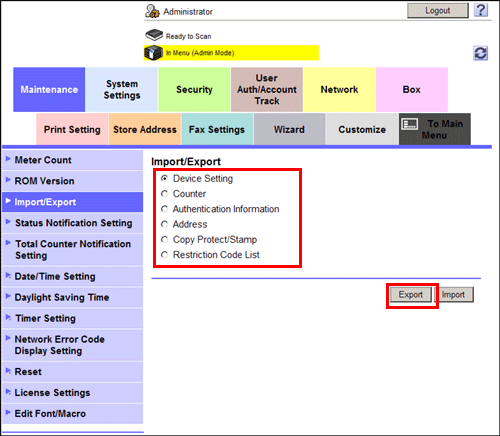 In the administrator mode, select [Maintenance] - [Import/Export] to select the information to be exported, then click [Export].