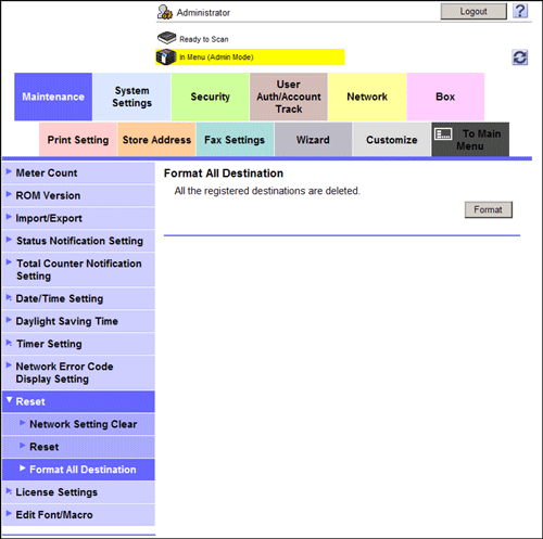 In the administrator mode, select [Maintenance] - [Reset] - [Format All Destination], then click [Format].
