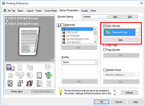 In the [Stamp/Composition] tab, select the [Copy Security] check box, and then select [Password Copy].
