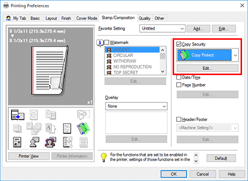 In the [Stamp/Composition] tab, select the [Copy Security] check box, and then select [Copy Protect].