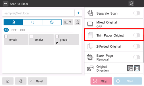 When scanning an original that is thinner than plain paper on the ADF, set this option to ON. This function reduces the original feed speed of the ADF to prevent thin paper from getting caught.