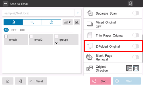 If a folded original is loaded into the ADF, the original size may not be able be detected accurately. To scan the folded original on the ADF, set this option to ON.