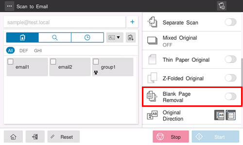 When [Blank Page Removal] is specified to scan an original including blank pages using the ADF, blank pages are excluded from scan targets. Blank pages detected are not counted as original pages.