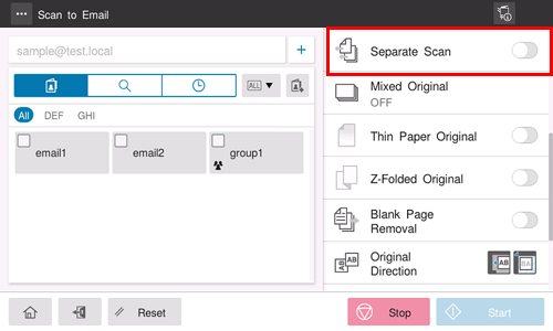 • [Number of Page separation]: When [Page Separation] is set to ON, enter the number of separated pages. For example, if you enter "2" to scan 10 original pages, the original is divided into five separate files.