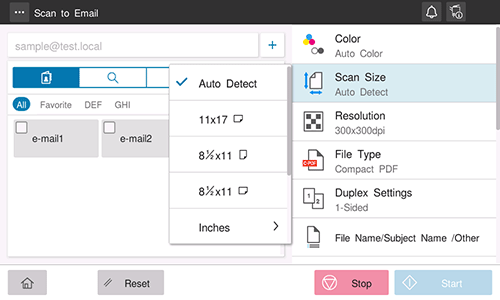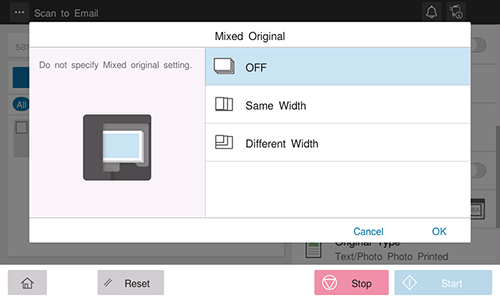 Even for an original with pages of different sizes, by using the ADF, you can scan data while detecting the size of each page. If the widths of the originals are the same, select [Same Width]. If the widths of the originals are different, select [Different Width].