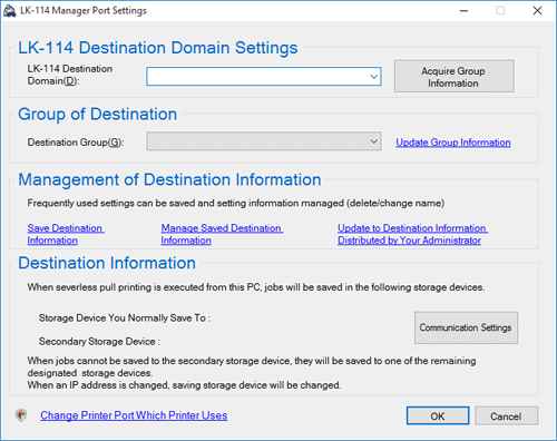You can switch the destination serverless pull printing group depending on the location you want to perform serverless pull printing at by saving destination information using LK-114_ManagerPort.
