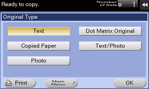 [Text/Photo] | Copies the original, which consists of text and photos, at the optimum level of image quality. This function sharpens the edges of each character and reproduces smoother photos.