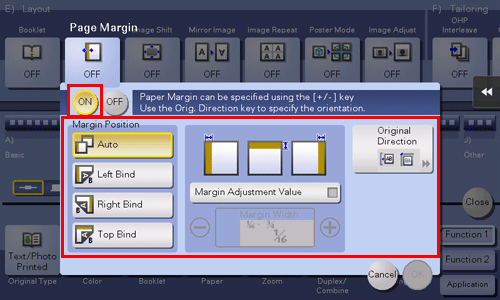 [Margin Position] | Select the position for creating the page margin for binding. When [Auto] is selected, the binding position is automatically set. |