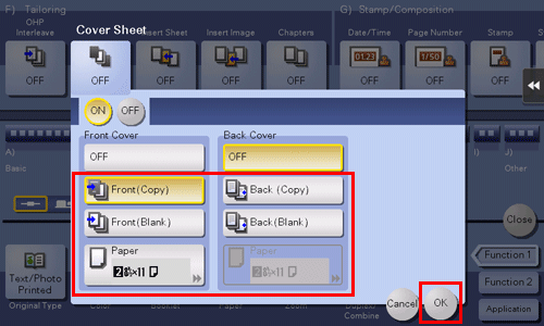 [Cover Sheet] | Use this option to copy the front and back covers onto separate paper when copying an original with a front or back cover. When copying an original without a front or back cover, you can use this function to have blank sheets of paper inserted as the front and back covers. |