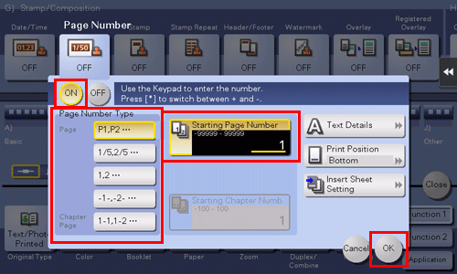 [Fold/Bind] | Select [Center Staple & Fold]. This function staples copies at two places along the center and folds the copies in half before feeding them out. |