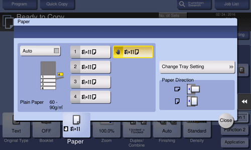 Tap [Paper], select Tray 1, Tray 2, or Bypass Tray, and tap [Change Tray Setting].