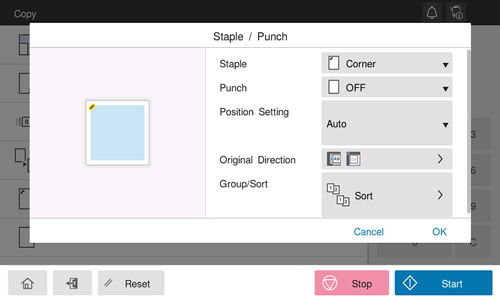 [Position Setting] | Select a desired staple or hole-punch position. Setting to [Auto] automatically determines the stapling and punching positions based on the direction of the loaded original. |