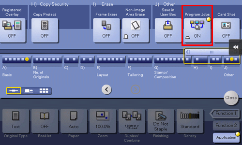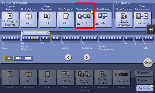 Scans each loaded original with different settings, and makes copies collectively. Use this function when various types of originals are mixed, such as 1-sided original to be printed on one side of paper, and 2-sided original to be copied by enlarging.