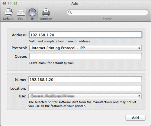 In [Address:], enter the IP address for the machine. In [Queue:], enter "ipp".