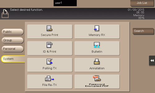 The System Box is used by the system to temporarily store files when the user uses the facsimile or print function together with the file storage function of the box.