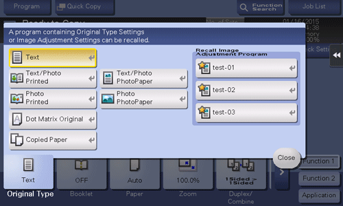 [Recall Image Adjustment Program] | Call the image quality adjustment program. The registered content of a program is applied. For image adjustment program, you can register the settings of [Original Type], [Density], [Bkgd. Removal], [Text Enhancement], [Neg-/Pos. Reverse], [Image Adjustment], and [Mirror Image]. For details on how to register, refer to Here. |