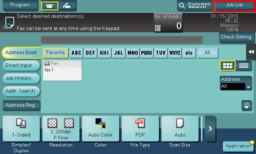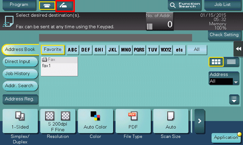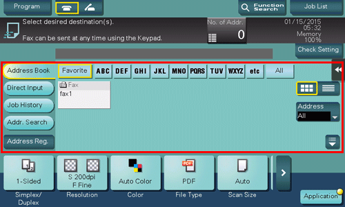 Fax numbers can be specified from [Address Book], [Direct Input], [Job History] or [Program]. For details on how to specify a destination, refer to Here. For details on how to specify a fax/scan program, refer to Here.