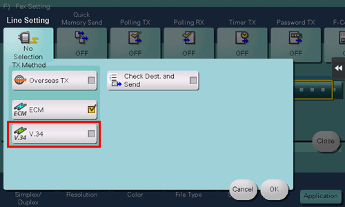 This machine uses the V.34 protocol communication by default. You can send faxes with V.34 canceled if it is not possible to establish a communication in the Super G3 mode depending on telephone line conditions (for example, when the remote or this machine is connected to a PBX line).