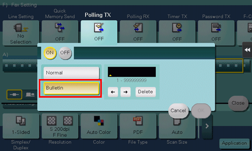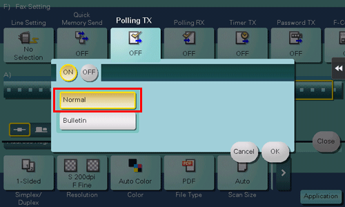 Tap [Application] - [Fax Setting] - [Polling TX], then tap [ON].