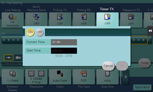 Tap [Application] - [Fax Setting] - [Timer TX], then tap [ON].