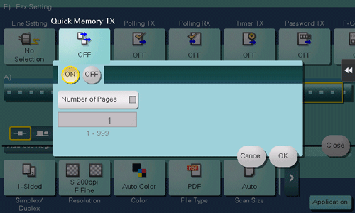 Tap [Application] - [Fax Setting] - [Quick Memory TX], then tap [ON].