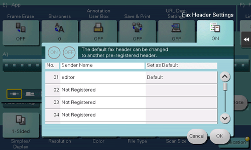 Changes on [Fax Header Settings] are only temporary. It is useful to specify frequently used sender names as defaults when registering sender names.