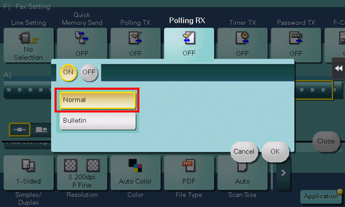 Tap [Application] - [Fax Setting] - [Polling RX], then tap [ON].