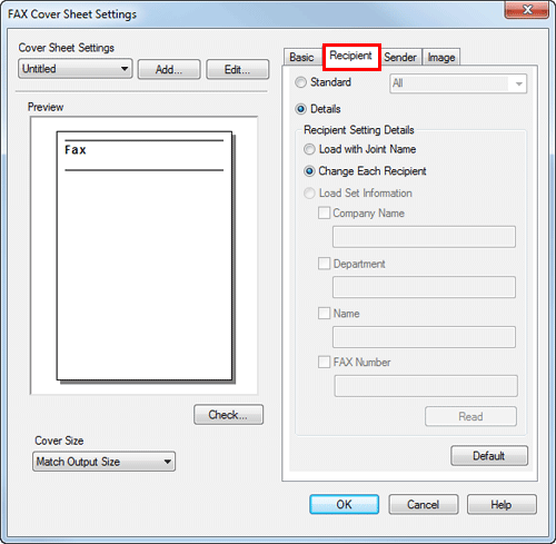 This option changes the information written on the cover sheet for each recipient. Enter the contents of [Recipient List] displayed in the [FAX Transmission Popup] screen.
