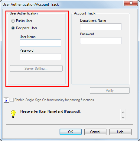 2. When user authentication is enabled, select [Recipient User], then enter the user name and password.