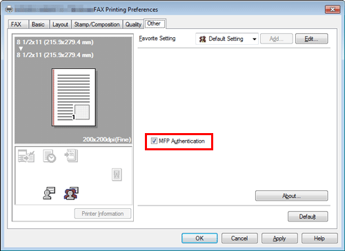 If user authentication and account track have already been employed, each user needs to send his/her authentication information (the user name and password) to this machine when sending PC-Fax. This limits the users who can send PC-Fax via the machine and prevents unauthorized use by third parties.