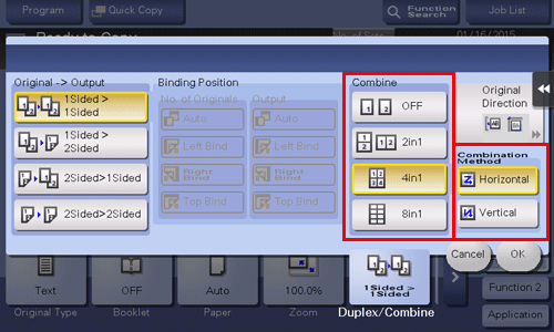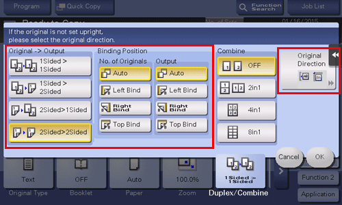 [Original > Output] | Select a combination of the original to be loaded (1-sided original or 2-sided original) and the copy method (1-sided copy or 2-sided copy). If you have selected other than [1Sided > 1Sided], also specify [Binding Position] and [Original Direction]. | |