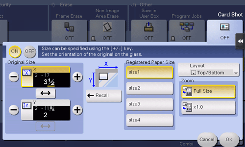 [Original Size] | Specify the size of the card to copy by tapping [+]/[-] for the inch area, by tapping [+]/[-] or Keypad for the centimeter area. To display the Keypad, tap the input area for the numeral. From the [Registered Paper Size], you can recall a size previously stored and specify the size. |