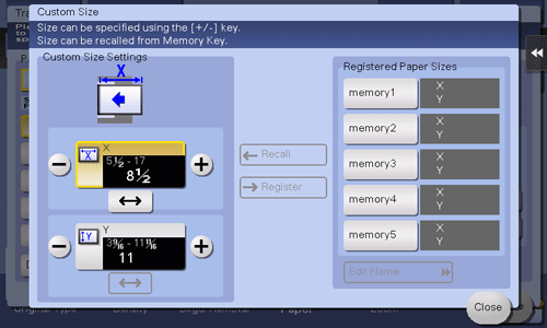 [Custom Size Settings] | For the inch area, tap [+]/[-] or the keypad to enter the length (X) and width (Y) of the paper. After you have entered the size, select a key ([memory1] to [memory5]) in [Registered Paper Sizes], and tap [New]. Then the size you have entered is registered in the memory. You can recall the registered size in the future. |