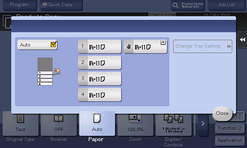 [1] - [4] | Tap this button to specify paper loaded into any of Tray1 to Tray4 to make a copy. |