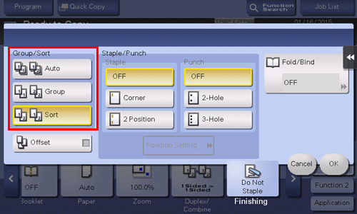Automatically switches between Sort and Group according to the number of printed sheets for each set, and feeds out. If the number of printed sheets for each set is 1, the Group function is applied. If the number is 2 or larger, the Sort function is applied.