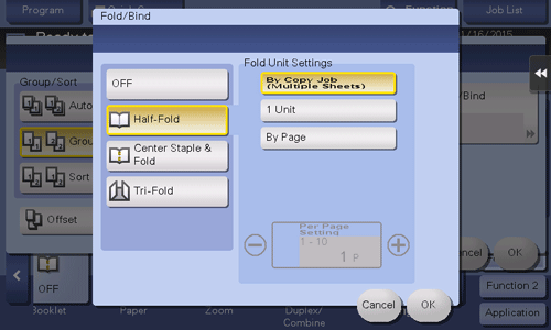 Feeds out a copied sheet by folding it in two. Also select the unit by which the paper is folded from [By Copy Job (Multiple Sheets)], [1 Unit], and [By Page]. When you set [By Page], specify the number of pages to be folded at one time.