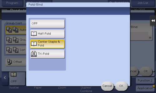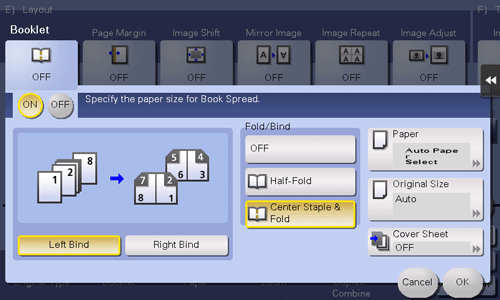 • If Center Staple is enabled, [Booklet] is set to [ON] automatically.