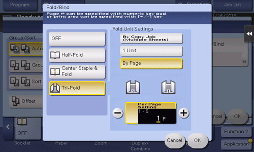 Feeds out a copied sheet by folding it in three. Also select the unit by which the paper is folded from [By Copy Job (Multiple Sheets)], [1 Unit], and [By Page]. When you set [By Page], specify the number of pages to be folded at one time.