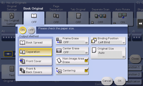 [ON]/[OFF] | Select [ON] to specify Book Original. |