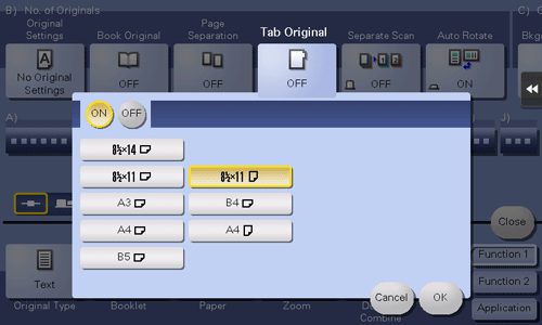 [ON]/[OFF] | Select [ON] to copy an index original. Also select the size of the index original. |