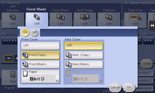 [ON]/[OFF] | Select [ON] to specify Cover Sheet. |