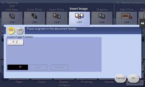 [Insert Page Position] | Specify a page number you want to insert a sheet into. The original is inserted after the page you have specified.