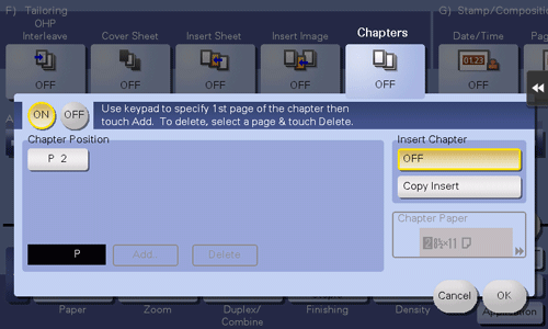 [Chapter Paper] | If [Insert Chapter] is set to [Copy Insert], select the paper tray where the Chapter Paper is stacked. If the chapter paper and text paper differ, use the same size of paper and stack them in the correct direction. |